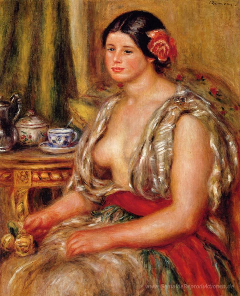 Wir bieten Ihnen eine handgefertigte Reproduktion auf Leinwand des berühmten Kunstwerks 'Junge Frau in einer orientalischen Kostüm Sitz' von Pierre-Auguste Renoir, aus dem Reproduktionsmuseum.