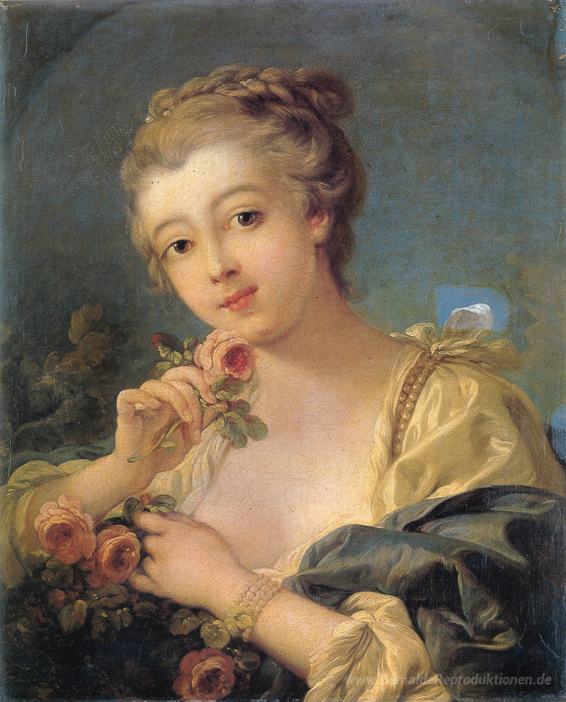 Wir bieten Ihnen eine handgefertigte Reproduktion auf Leinwand des berühmten Kunstwerks 'Junge Frau mit einem Blumenstrauß der Rosen' von Francois Boucher, aus dem Reproduktionsmuseum.