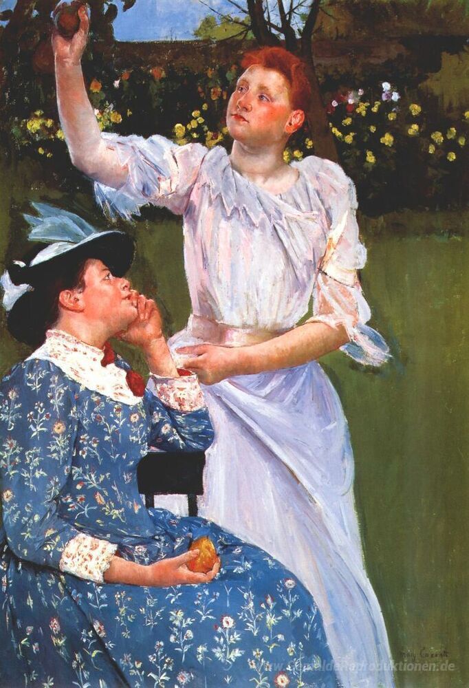 Wir bieten Ihnen eine handgefertigte Reproduktion auf Leinwand des berühmten Kunstwerks 'Junge Frau-Sammeln-Frucht' von Mary Cassatt, aus dem Reproduktionsmuseum.