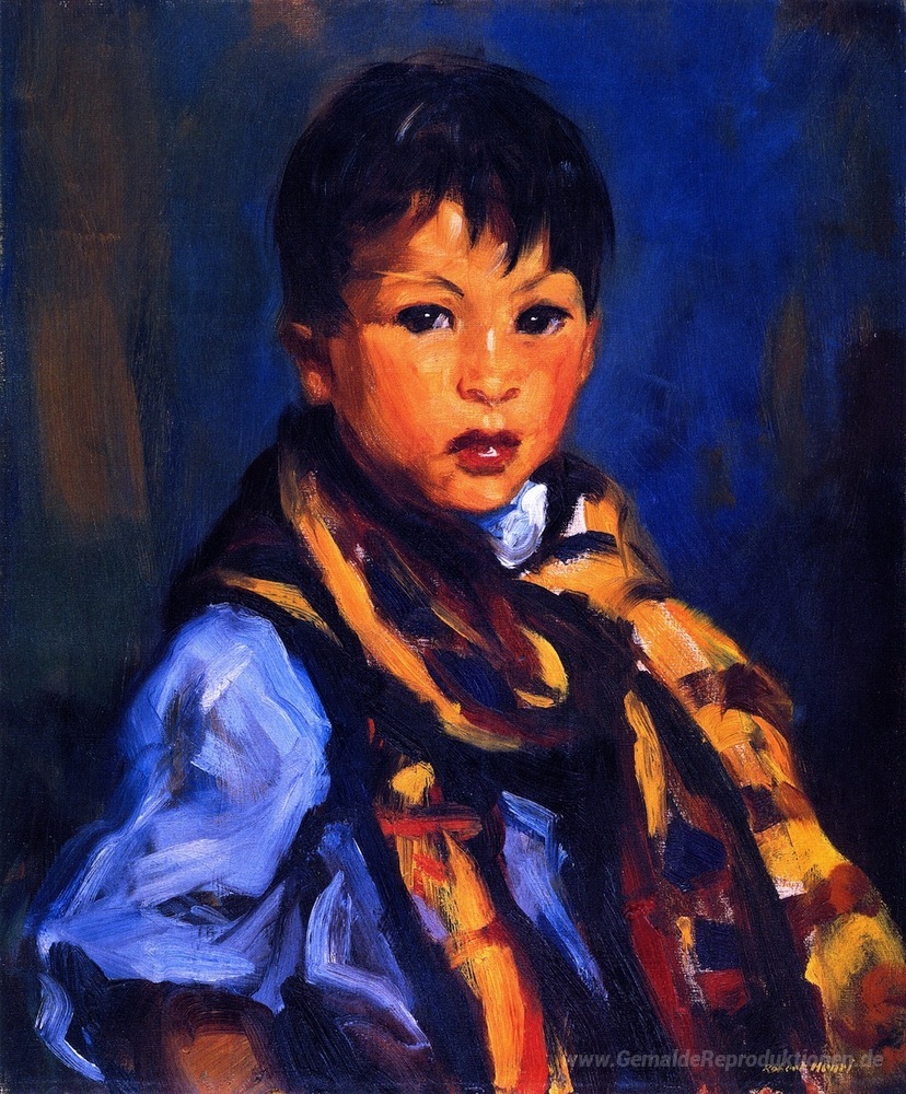 Wir bieten Ihnen eine handgefertigte Reproduktion auf Leinwand des berühmten Kunstwerks 'Junge mit Tartan Schal' von Robert Henri, aus dem Reproduktionsmuseum.