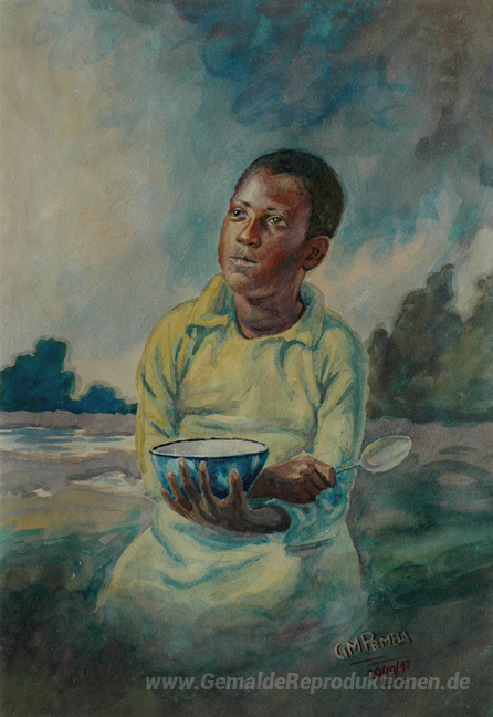Wir bieten Ihnen eine handgefertigte Reproduktion auf Leinwand des berühmten Kunstwerks 'Junger Junge mit einer Schüssel und Löffel' von George Pemba, aus dem Reproduktionsmuseum.