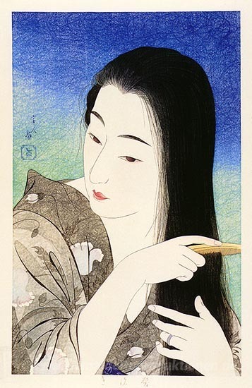 Wir bieten Ihnen eine handgefertigte Reproduktion auf Leinwand des berühmten Kunstwerks 'Kämmen der Haare' von Torii Kotondo, aus dem Reproduktionsmuseum.