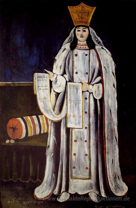 Wir bieten Ihnen eine handgefertigte Reproduktion auf Leinwand des berühmten Kunstwerks 'Königin Tamar' von Niko Pirosmani, aus dem Reproduktionsmuseum.