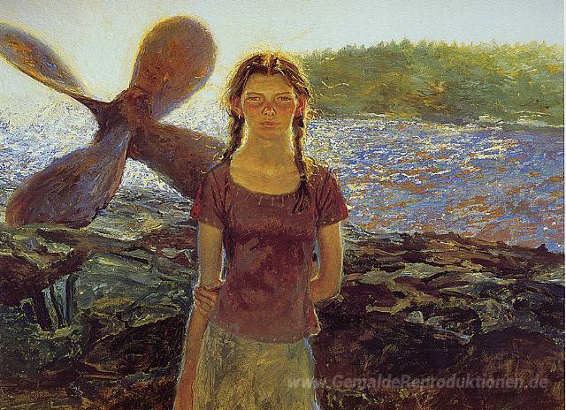 Wir bieten Ihnen eine handgefertigte Reproduktion auf Leinwand des berühmten Kunstwerks 'Katie Southern' von Jamie Wyeth, aus dem Reproduktionsmuseum.