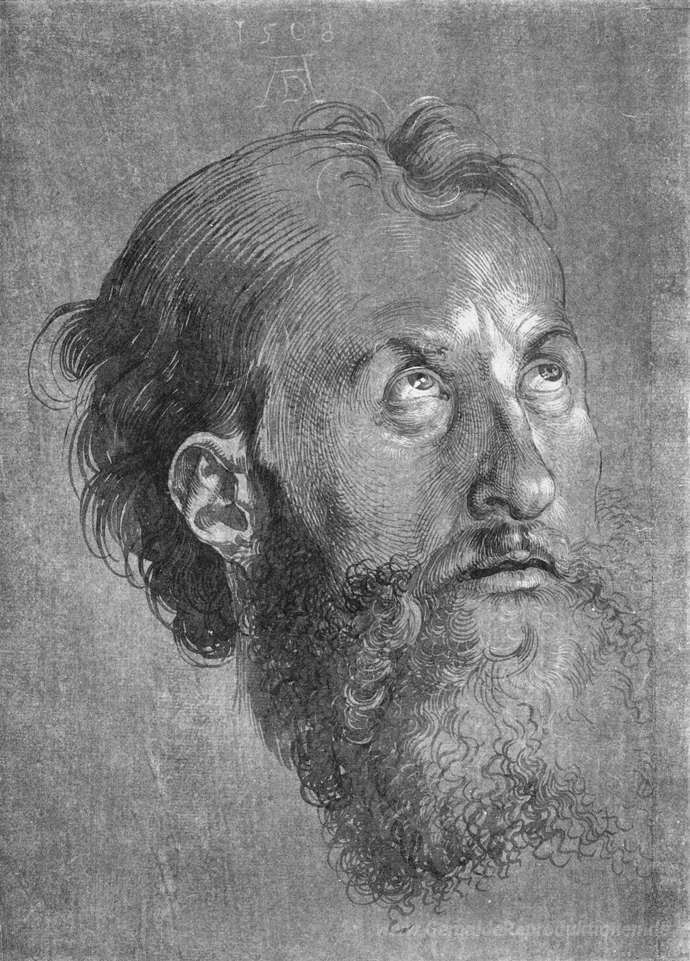 Wir bieten Ihnen eine handgefertigte Reproduktion auf Leinwand des berühmten Kunstwerks 'Kopf eines Apostels suchen nach oben' von Albrecht Durer, aus dem Reproduktionsmuseum.