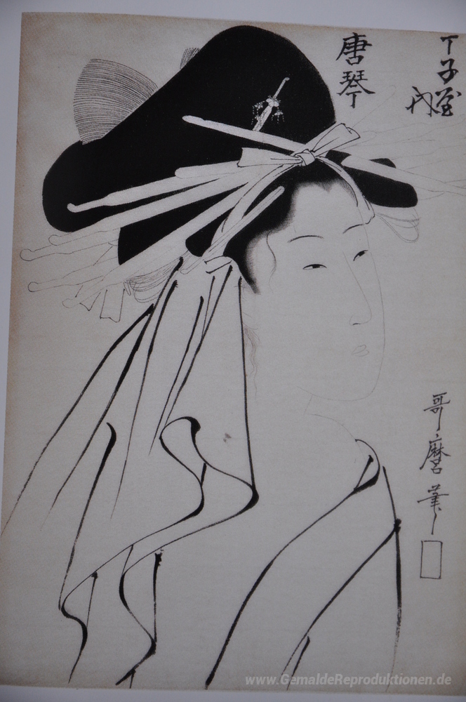 Wir bieten Ihnen eine handgefertigte Reproduktion auf Leinwand des berühmten Kunstwerks 'Kurtisane Karakot' von Kitagawa Utamaro, aus dem Reproduktionsmuseum.