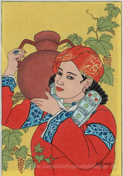 Wir bieten Ihnen eine handgefertigte Reproduktion auf Leinwand des berühmten Kunstwerks 'La Cruche, Mongolie' von Paul Jacoulet, aus dem Reproduktionsmuseum.