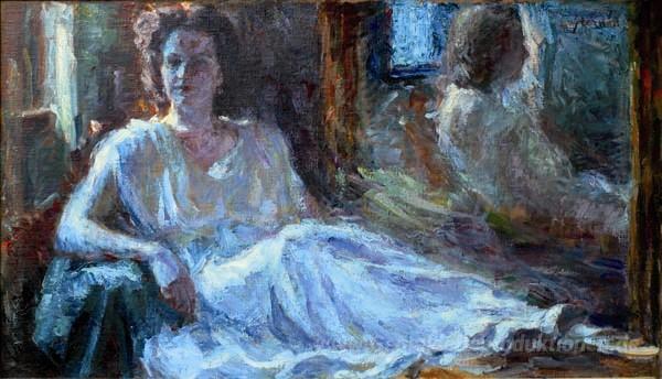 Wir bieten Ihnen eine handgefertigte Reproduktion auf Leinwand des berühmten Kunstwerks 'Lady in Blue' von Matej Sternen, aus dem Reproduktionsmuseum.
