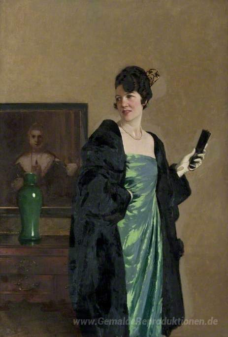 Wir bieten Ihnen eine handgefertigte Reproduktion auf Leinwand des berühmten Kunstwerks 'Lady in einem grünen Kleid' von George Henry, aus dem Reproduktionsmuseum.
