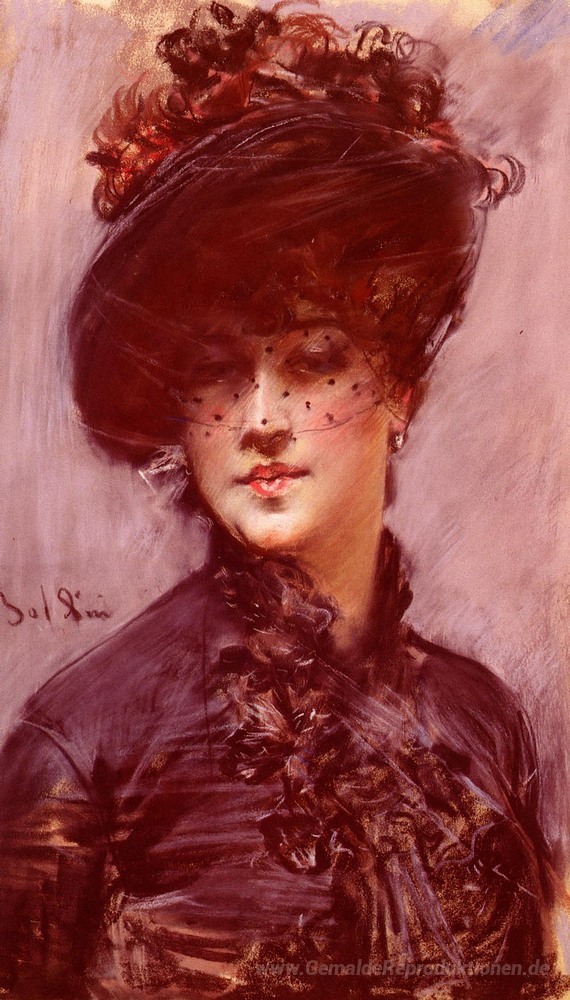 Wir bieten Ihnen eine handgefertigte Reproduktion auf Leinwand des berühmten Kunstwerks 'Lady mit einem schwarzen Hut' von Giovanni Boldini, aus dem Reproduktionsmuseum.