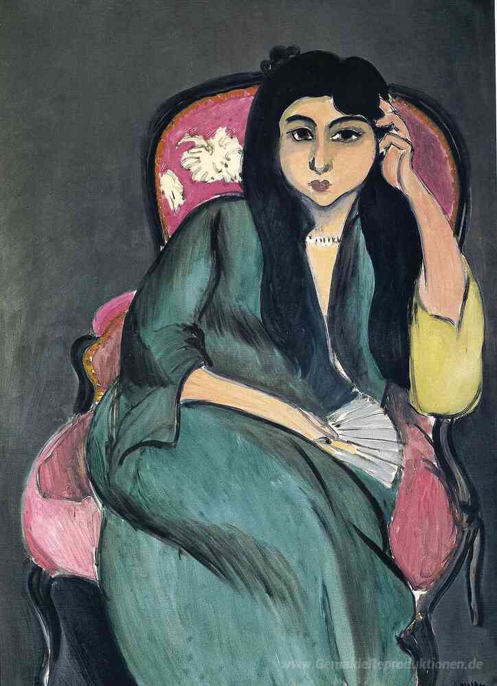 Wir bieten Ihnen eine handgefertigte Reproduktion auf Leinwand des berühmten Kunstwerks 'Laurette in Green in einem Rosa Stuhl' von Henri Matisse, aus dem Reproduktionsmuseum.