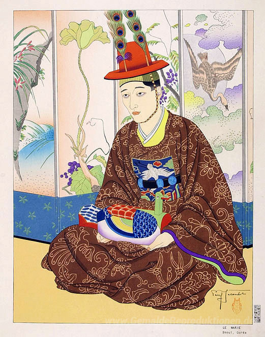 Wir bieten Ihnen eine handgefertigte Reproduktion auf Leinwand des berühmten Kunstwerks 'Le Marie. Seoul, Coree' von Paul Jacoulet, aus dem Reproduktionsmuseum.