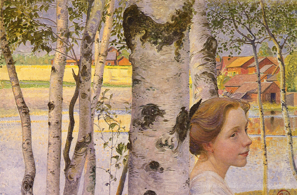 Wir bieten Ihnen eine handgefertigte Reproduktion auf Leinwand des berühmten Kunstwerks 'Lisbeth am Birkenhain' von Carl Larsson, aus dem Reproduktionsmuseum.
