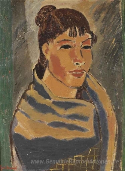 Wir bieten Ihnen eine handgefertigte Reproduktion auf Leinwand des berühmten Kunstwerks 'Mädchen mit blauem Schal' von Gustave de Smet, aus dem Reproduktionsmuseum.