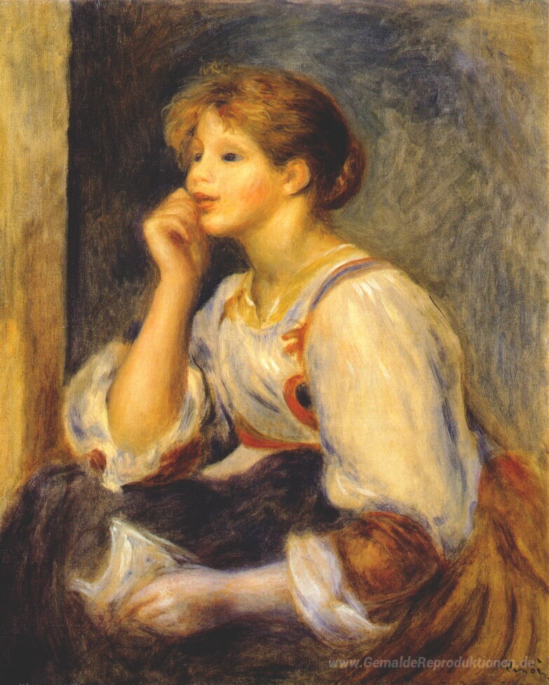 Wir bieten Ihnen eine handgefertigte Reproduktion auf Leinwand des berühmten Kunstwerks 'Mädchen mit einem Buchstaben' von Pierre-Auguste Renoir, aus dem Reproduktionsmuseum.