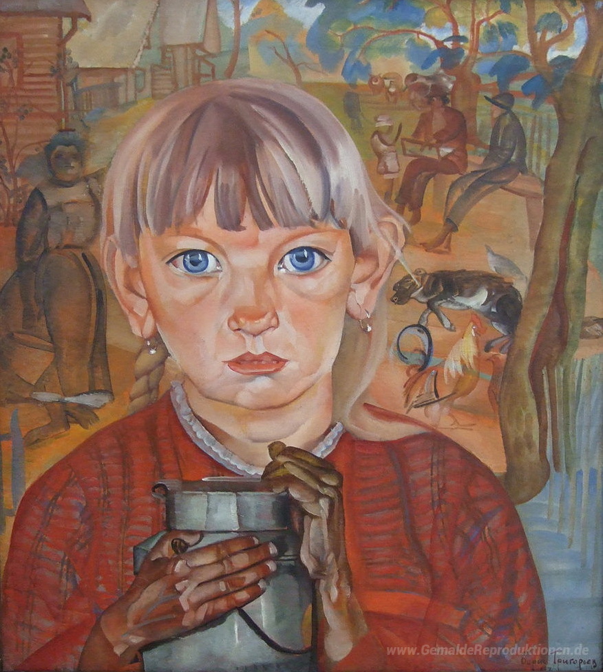 Wir bieten Ihnen eine handgefertigte Reproduktion auf Leinwand des berühmten Kunstwerks 'Mädchen mit Milchkanne' von Boris Grigoriev, aus dem Reproduktionsmuseum.