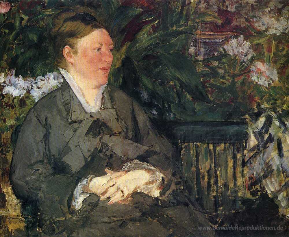 Wir bieten Ihnen eine handgefertigte Reproduktion auf Leinwand des berühmten Kunstwerks 'Madame Manet im Wintergarten' von Edouard Manet, aus dem Reproduktionsmuseum.