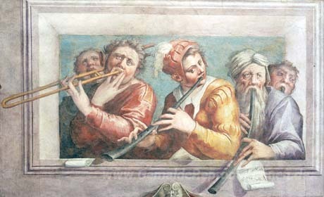 Wir bieten Ihnen eine handgefertigte Reproduktion auf Leinwand des berühmten Kunstwerks 'Musiker' von Giorgio Vasari, aus dem Reproduktionsmuseum.