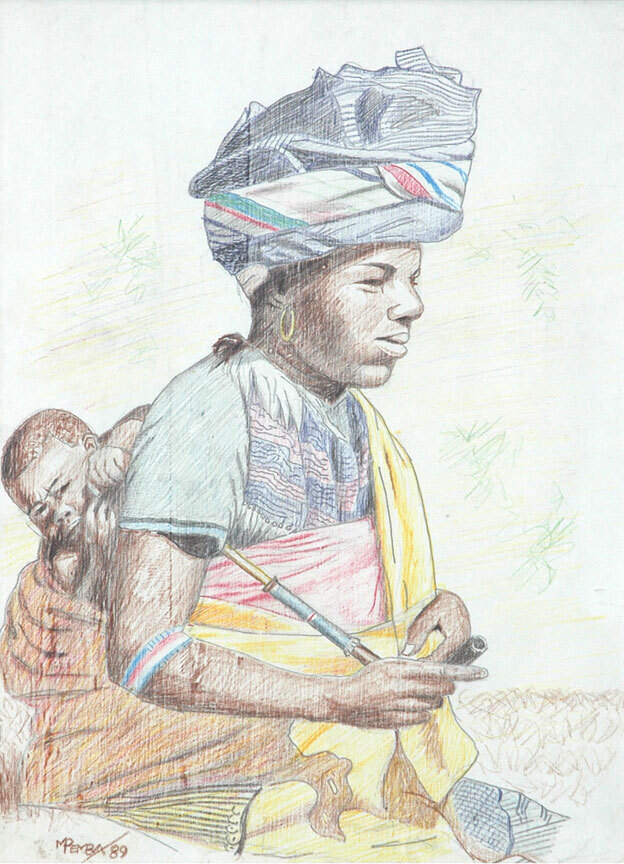 Wir bieten Ihnen eine handgefertigte Reproduktion auf Leinwand des berühmten Kunstwerks 'Mutter mit Baby' von George Pemba, aus dem Reproduktionsmuseum.
