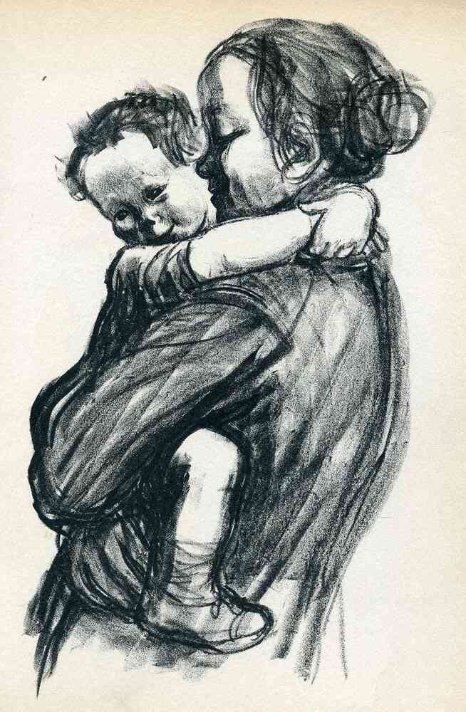 Wir bieten Ihnen eine handgefertigte Reproduktion auf Leinwand des berühmten Kunstwerks 'Mutter mit Kind' von Kathe Kollwitz, aus dem Reproduktionsmuseum.
