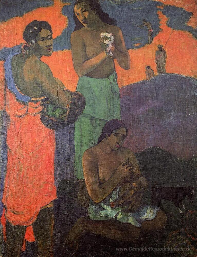 Wir bieten Ihnen eine handgefertigte Reproduktion auf Leinwand des berühmten Kunstwerks 'Mutterschaft (Drei Frauen auf der Küste)' von Paul Gauguin, aus dem Reproduktionsmuseum.