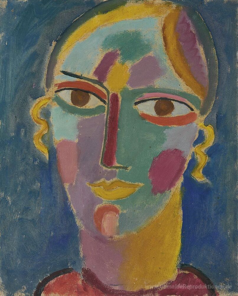 Wir bieten Ihnen eine handgefertigte Reproduktion auf Leinwand des berühmten Kunstwerks 'Mystischer Kopf: Frauenkopf auf blauem Grund' von Alexej von Jawlensky, aus dem Reproduktionsmuseum.
