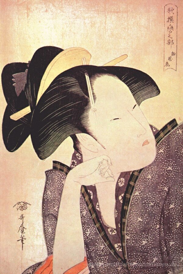 Willkommen in unserer exklusiven Galerie, wo Sie die zeitlose Schönheit von Ölgemälden entdecken können. Eines der herausragenden Werke, das wir Ihnen präsentieren, ist Nachdenkliche Liebe von Kitagawa Utamaro. Utamaro, ein Meister des japanischen Ukiyo-e, bringt in seinen Gemälden eine unverwechselbare Sensibilität und Detailtreue zum Ausdruck, die den Betrachter sofort in ihren Bann zieht. Sein einzigartiger Stil vereint zarte Farben mit feinen Linien und vermittelt emotionale Tiefe, die den Raum, in dem das Kunstwerk hängt, zum Leben erweckt.