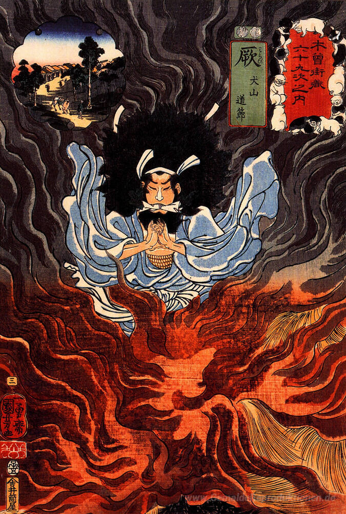 Wir bieten Ihnen eine handgefertigte Reproduktion auf Leinwand des berühmten Kunstwerks 'Neunundsechzig Stationen des Kisokaido: Warabi, Inuyama Dosetsu,' von Utagawa Kuniyoshi, aus dem Reproduktionsmuseum.