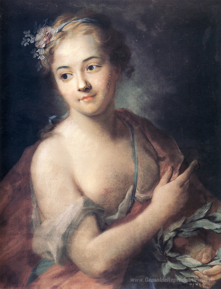 Wir bieten Ihnen eine handgefertigte Reproduktion auf Leinwand des berühmten Kunstwerks 'Nymph gefolgt von Apollo hält einen Lorbeerkranz' von Maurice Quentin de La Tour, aus dem Reproduktionsmuseum.