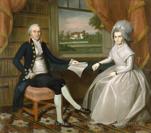 Wir bieten Ihnen eine handgefertigte Reproduktion auf Leinwand des berühmten Kunstwerks 'Oliver und Abigail Wolcott Ellsworth' von Ralph Earl, aus dem Reproduktionsmuseum.
