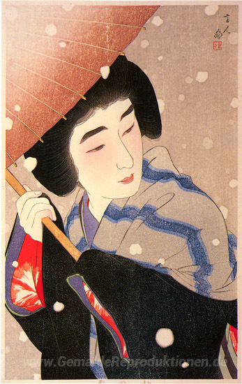 Wir bieten Ihnen eine handgefertigte Reproduktion auf Leinwand des berühmten Kunstwerks 'Peony Schneeflocken' von Torii Kotondo, aus dem Reproduktionsmuseum.