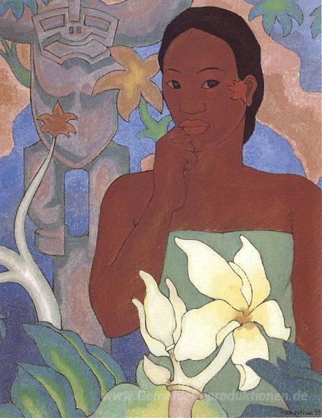 Wir bieten Ihnen eine handgefertigte Reproduktion auf Leinwand des berühmten Kunstwerks 'Polynesische Frau und Tiki' von Arman Manookian, aus dem Reproduktionsmuseum.