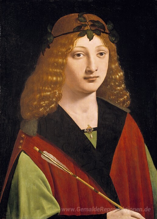 Wir bieten Ihnen eine handgefertigte Reproduktion auf Leinwand des berühmten Kunstwerks 'Porträt einer Jugend, die ein Pfeil' von Giovanni Antonio Boltraffio, aus dem Reproduktionsmuseum.