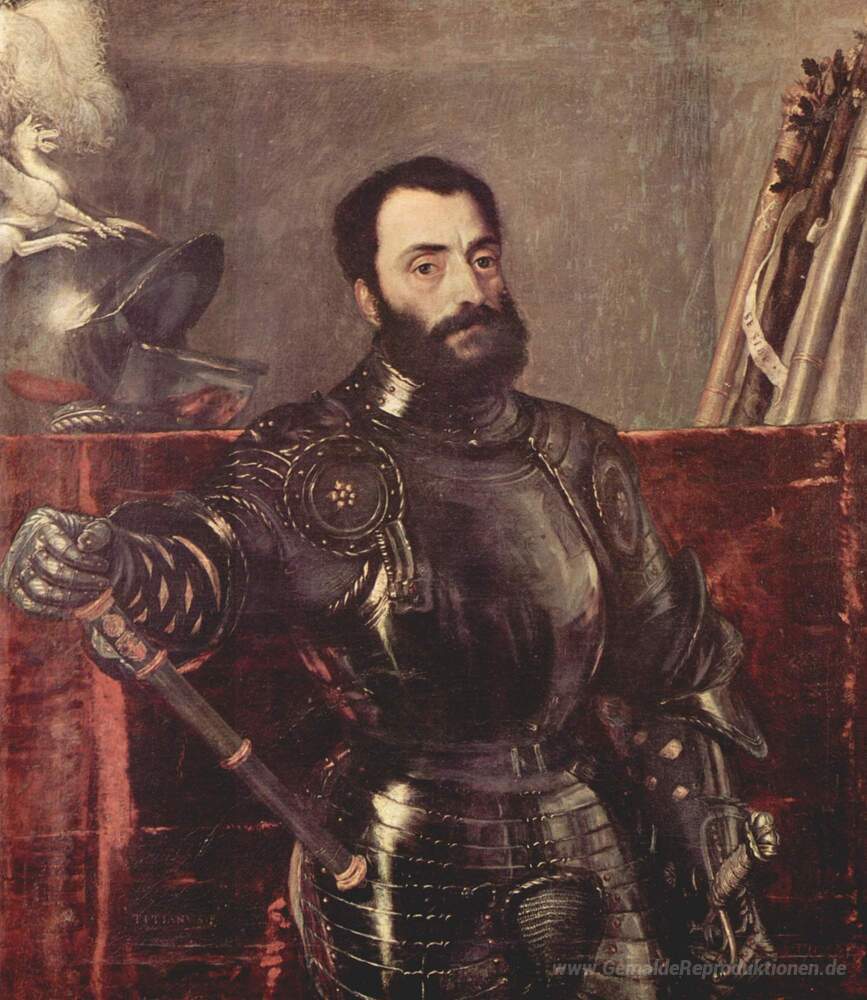 Wir bieten Ihnen eine handgefertigte Reproduktion auf Leinwand des berühmten Kunstwerks 'Porträt von Francesco Maria della Rovere' von Titian, aus dem Reproduktionsmuseum.