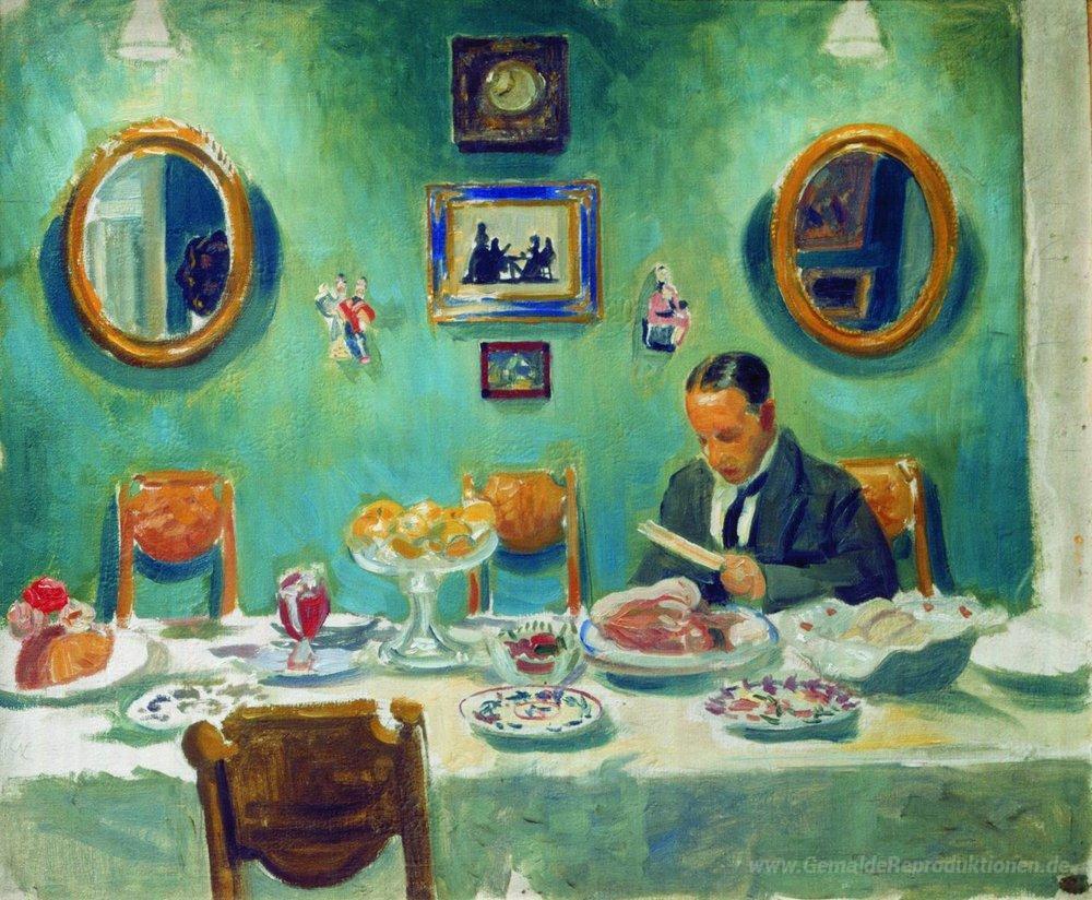Wir bieten Ihnen eine handgefertigte Reproduktion auf Leinwand des berühmten Kunstwerks 'Porträt von M. V. Dobuzhinsky am Tisch' von Boris Kustodiev, aus dem Reproduktionsmuseum.