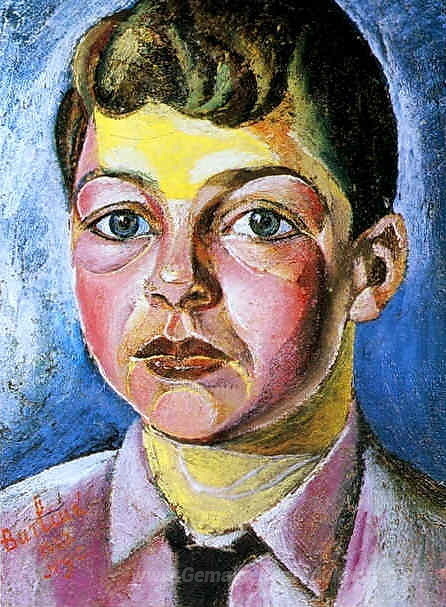Wir bieten Ihnen eine handgefertigte Reproduktion auf Leinwand des berühmten Kunstwerks 'Porträt von Nicolas, der Sohn des Künstlers' von David Burliuk, aus dem Reproduktionsmuseum.