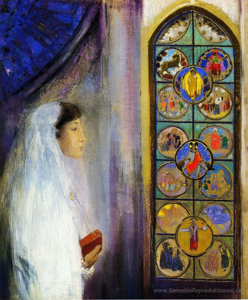 Wir bieten Ihnen eine handgefertigte Reproduktion auf Leinwand des berühmten Kunstwerks 'Porträt von Simone Fayet in der heiligen Kommunion' von Odilon Redon, aus dem Reproduktionsmuseum.