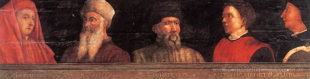 Wir bieten Ihnen eine handgefertigte Reproduktion auf Leinwand des berühmten Kunstwerks 'Porträts von Giotto, Uccello, Donatello, und Bruno Manetti' von Paolo Uccello, aus dem Reproduktionsmuseum.