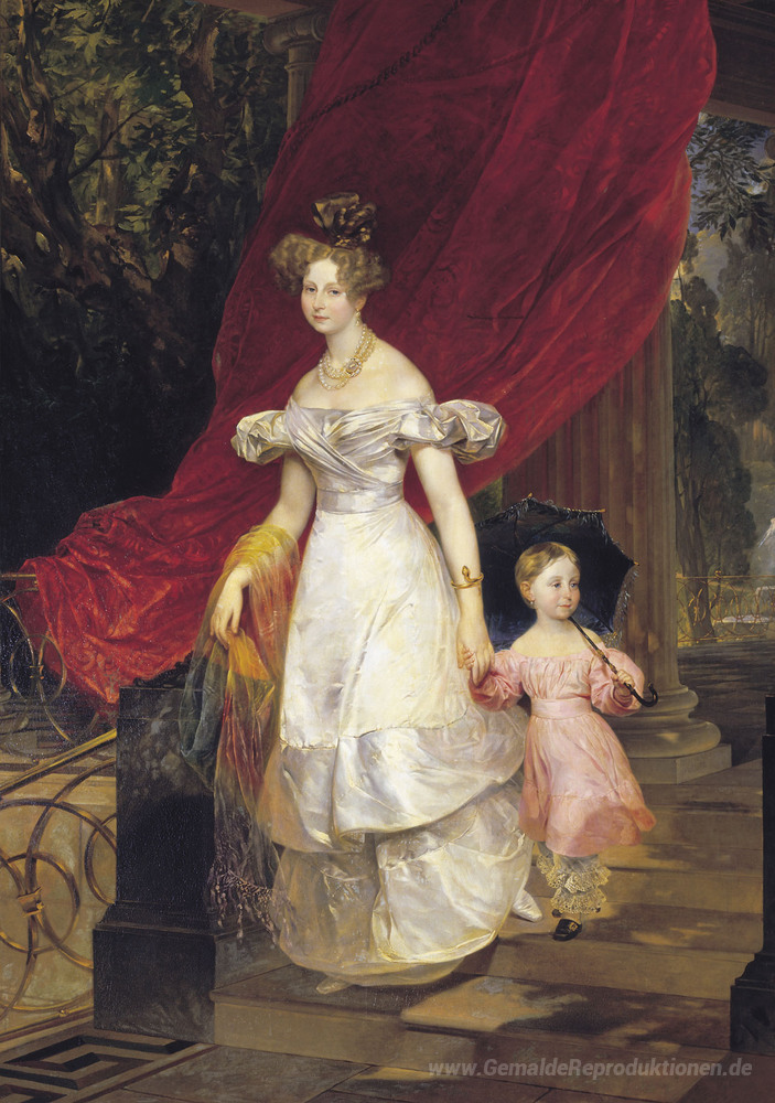 Wir bieten Ihnen eine handgefertigte Reproduktion auf Leinwand des berühmten Kunstwerks 'Portrait der Großherzogin Elena Pawlowna und ihre Tochter Maria' von Karl Bryullov, aus dem Reproduktionsmuseum.