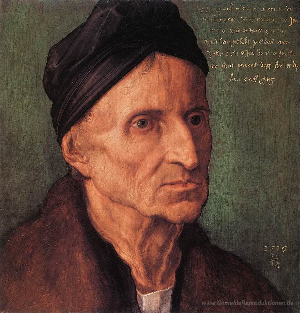 Wir bieten Ihnen eine handgefertigte Reproduktion auf Leinwand des berühmten Kunstwerks 'Portrait der Nürnberger Maler Michael Wolgemut' von Albrecht Durer, aus dem Reproduktionsmuseum.