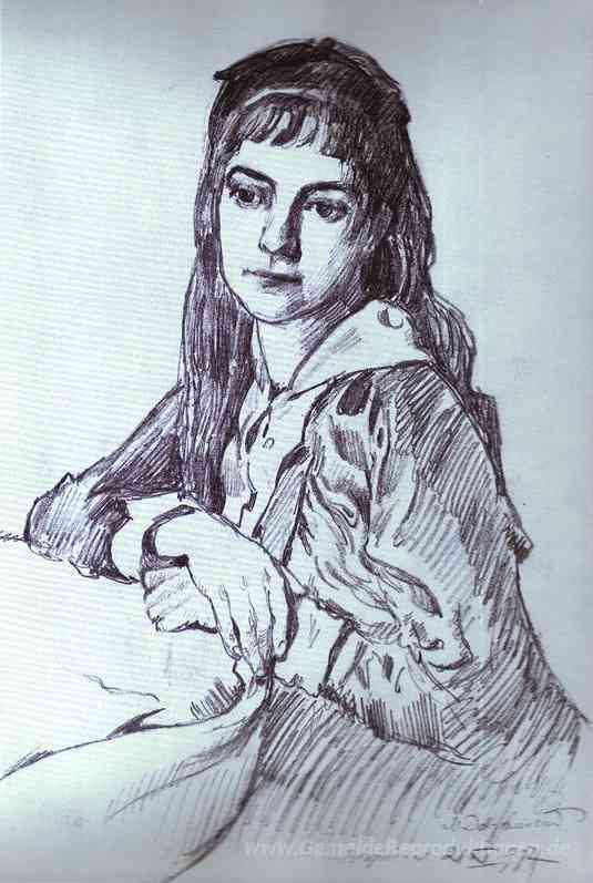 Wir bieten Ihnen eine handgefertigte Reproduktion auf Leinwand des berühmten Kunstwerks 'Portrait der Tochter des Künstlers, Vera' von Mstislav Dobuzhinsky, aus dem Reproduktionsmuseum.