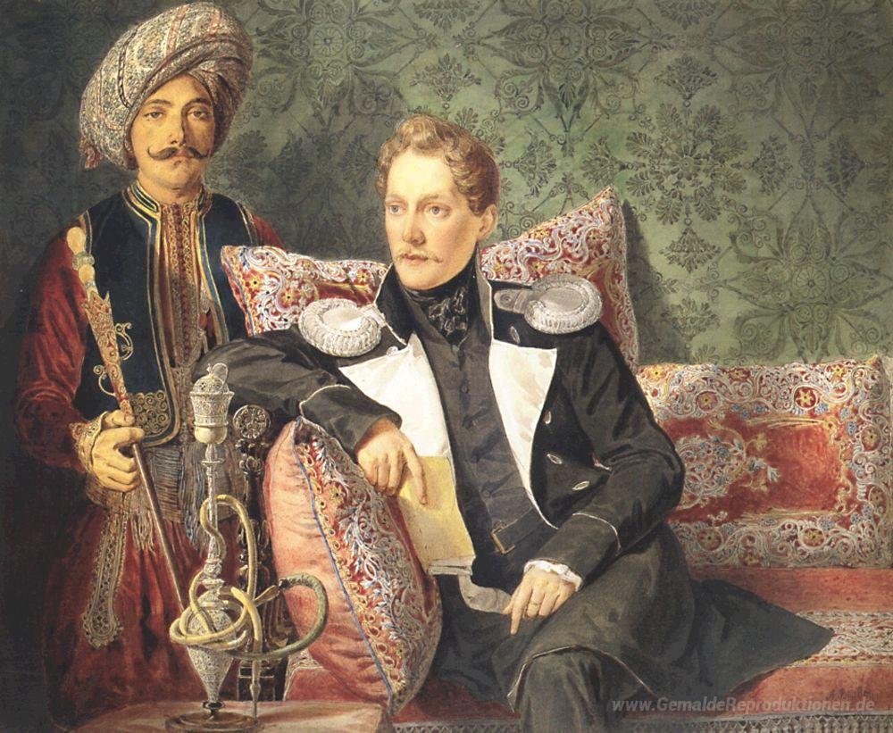 Wir bieten Ihnen eine handgefertigte Reproduktion auf Leinwand des berühmten Kunstwerks 'Portrait des Militärischen und sein Knecht' von Karl Bryullov, aus dem Reproduktionsmuseum.