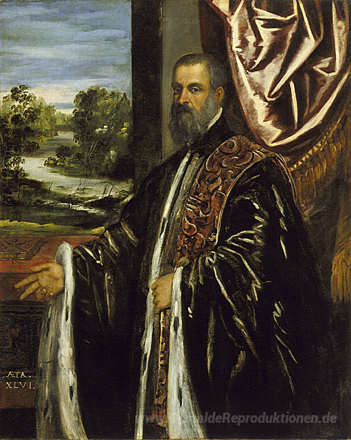 Wir bieten Ihnen eine handgefertigte Reproduktion auf Leinwand des berühmten Kunstwerks 'Portrait eines venezianischen Senators' von Tintoretto, aus dem Reproduktionsmuseum.