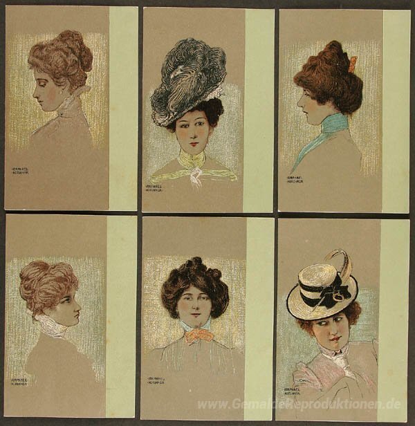 Wir bieten Ihnen eine handgefertigte Reproduktion auf Leinwand des berühmten Kunstwerks 'Portraits der Wiener Damen' von Raphael Kirchner, aus dem Reproduktionsmuseum.