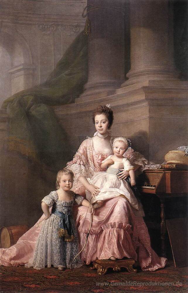 Wir bieten Ihnen eine handgefertigte Reproduktion auf Leinwand des berühmten Kunstwerks 'Queen Charlotte mit ihren zwei Kindern' von Allan Ramsay, aus dem Reproduktionsmuseum.