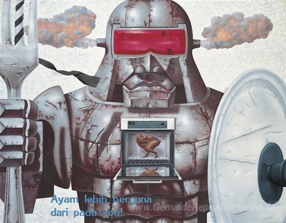 Wir bieten Ihnen eine handgefertigte Reproduktion auf Leinwand des berühmten Kunstwerks 'Robot dapur (Küche Roboter)' von Nyoman Masriadi, aus dem Reproduktionsmuseum.