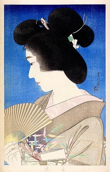 Wir bieten Ihnen eine handgefertigte Reproduktion auf Leinwand des berühmten Kunstwerks 'Sommer Geisha' von Torii Kotondo, aus dem Reproduktionsmuseum.