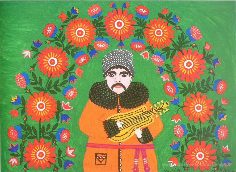 Wir bieten Ihnen eine handgefertigte Reproduktion auf Leinwand des berühmten Kunstwerks 'Taras Shevchenko Hryhorovych kommt aus seinem Exil zu Blüte Ukra' von Maria Primachenko, aus dem Reproduktionsmuseum.
