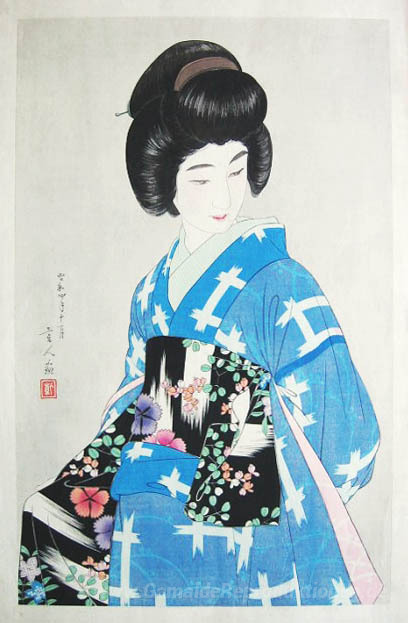 Wir bieten Ihnen eine handgefertigte Reproduktion auf Leinwand des berühmten Kunstwerks 'Vorbereitung ihrer Schärpe (blaue Variante)' von Torii Kotondo, aus dem Reproduktionsmuseum.