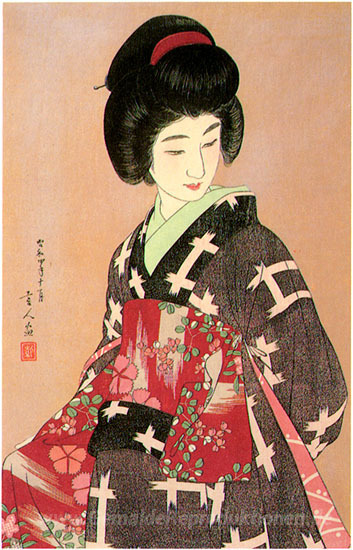 Wir bieten Ihnen eine handgefertigte Reproduktion auf Leinwand des berühmten Kunstwerks 'Vorbereitung ihrer Schärpe (grau-Variante)' von Torii Kotondo, aus dem Reproduktionsmuseum.